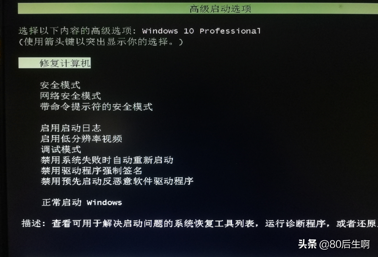 电脑关机状态下,按下开机键,等待系统徽标界面时(转圈圈),长按关机键关机,如此重复三次就可以看到正在准备修复,诊断电脑的界面,提示无法修复时,选择高级选项进入安全模式。