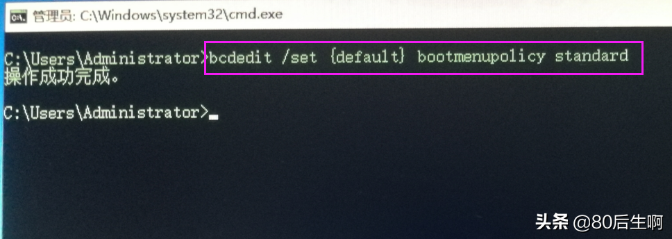 bcdedit /set {default} bootmenupolicy standard并回车即可。