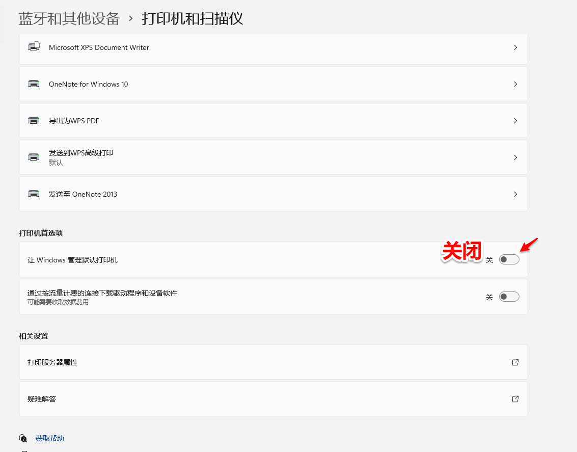 3、进入后先关闭让windows默认管理打印机,再点击选择上面列表中你要使用的打印机,如下图所示: