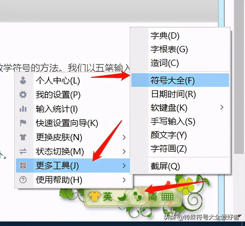 1:现在的输入法都是带有特殊符号输入的,在特殊符号输入里面就有数学符号,我们可以通过特殊符号里面的工具来实现数学符号的输入,这也是比较快速的输入数学符号的方法。我们以五笔输入法为例,我们可以通过下面的方法获得,我们先在输入法状态栏里面右键,就会弹出一个菜单,每个输入法的操作都差不多,效果如下