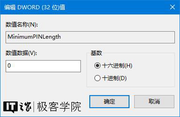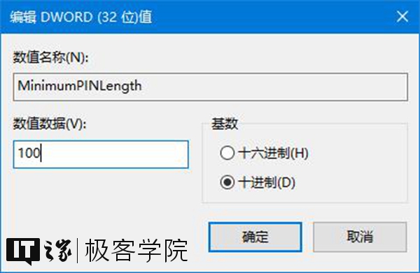 在这个窗口中,将基数设置为10进制,然后再将数值数据改为你期望的PIN码长度的最小值。比如IT之家小编希望限定PIN码的最短长度是100位,则在此处填入数字100。设置完成后,点击确定按钮。