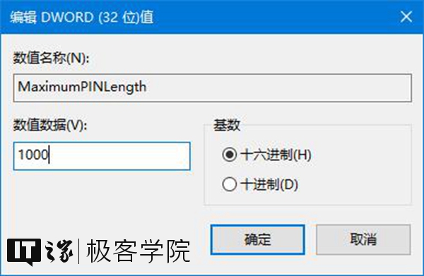 步骤和先前大同小异,即打开注册表编辑器,在左侧树状列表的PINComplexity项上点击鼠标右键,新建名为MaximumPINLength的DWORD(32位)值,双击该值,将基数设置为10进制,将数值数据设置为你期望的PIN码长度的最大值。比如IT之家小编希望限定PIN码的最长长度是1000位,则在此处填入数字1000。然后点击确定按钮。
