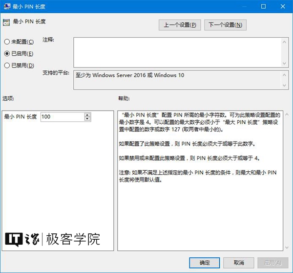若想设置最小PIN长度,则点击最小PIN长度项,在接下来弹出的窗口中,选择已启用,然后在下方的选项中,将最小PIN长度设置为你的期望值,最后,点击窗口右下角的确定按钮。