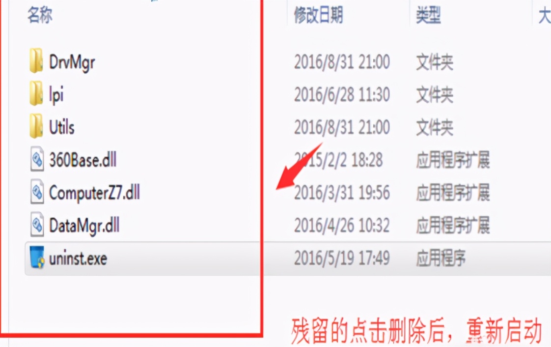 7、之后,最后一步是清除残留。在卸载程序的界面中,其余的都是无用的文件夹。右键单击并删除。