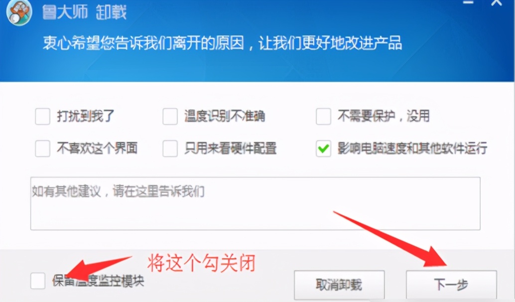6、单击下一步后,需要注意,即保留温度监控模块,删除此挂钩,否则卸载不干净,然后单击“下一步”,卸载成功。