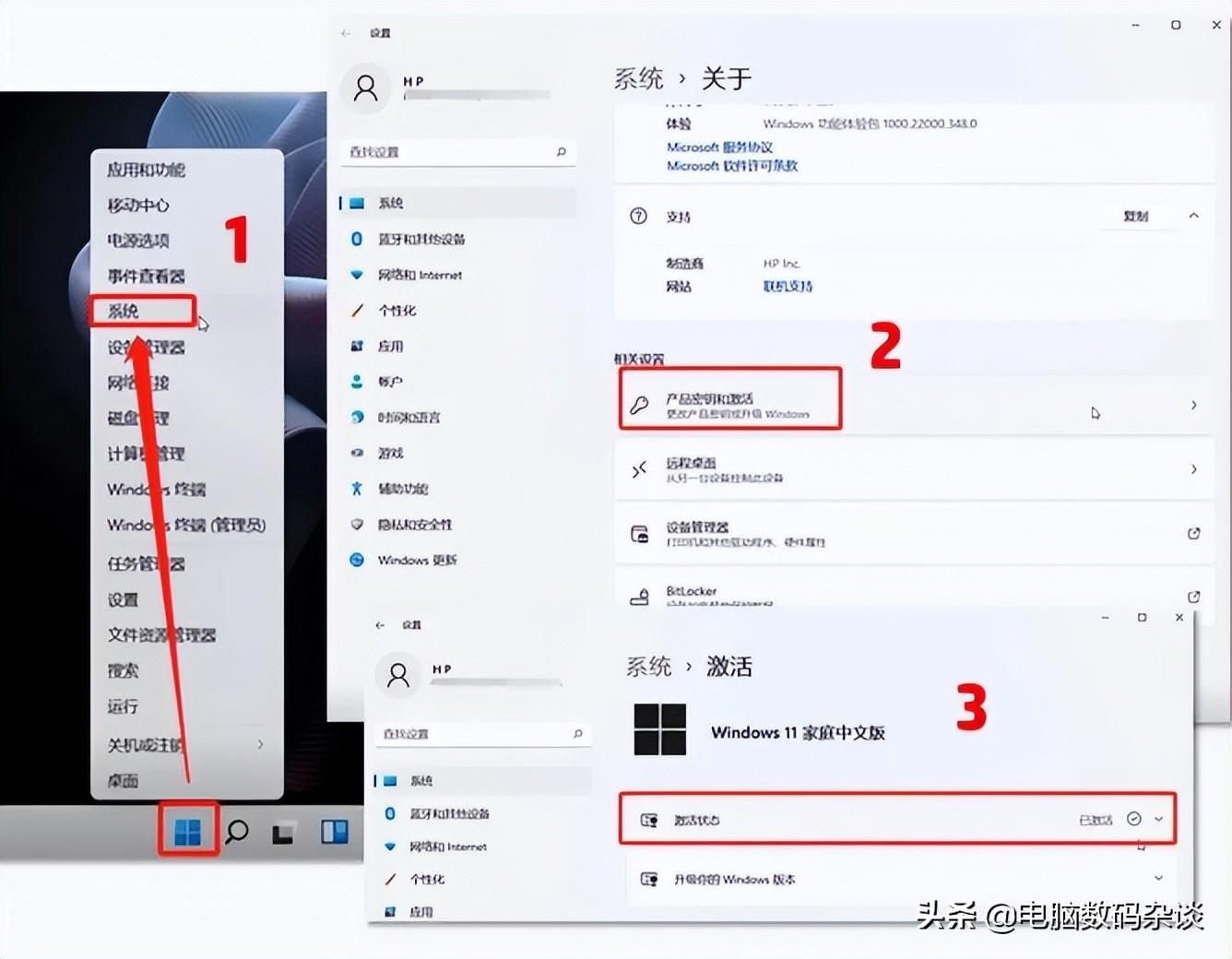 开始菜单右键,选择系统,下拉选择产品密钥和激活;系统状态显示已激活表示激活成功,若未激活联网自动激活。