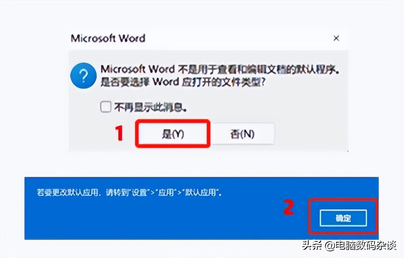 此时会弹出Microsoft Word不是用于查看和编辑文档的默认程序,是否要选择Word应打开的文件类型,选择是,接下来的提示界面选择确定。