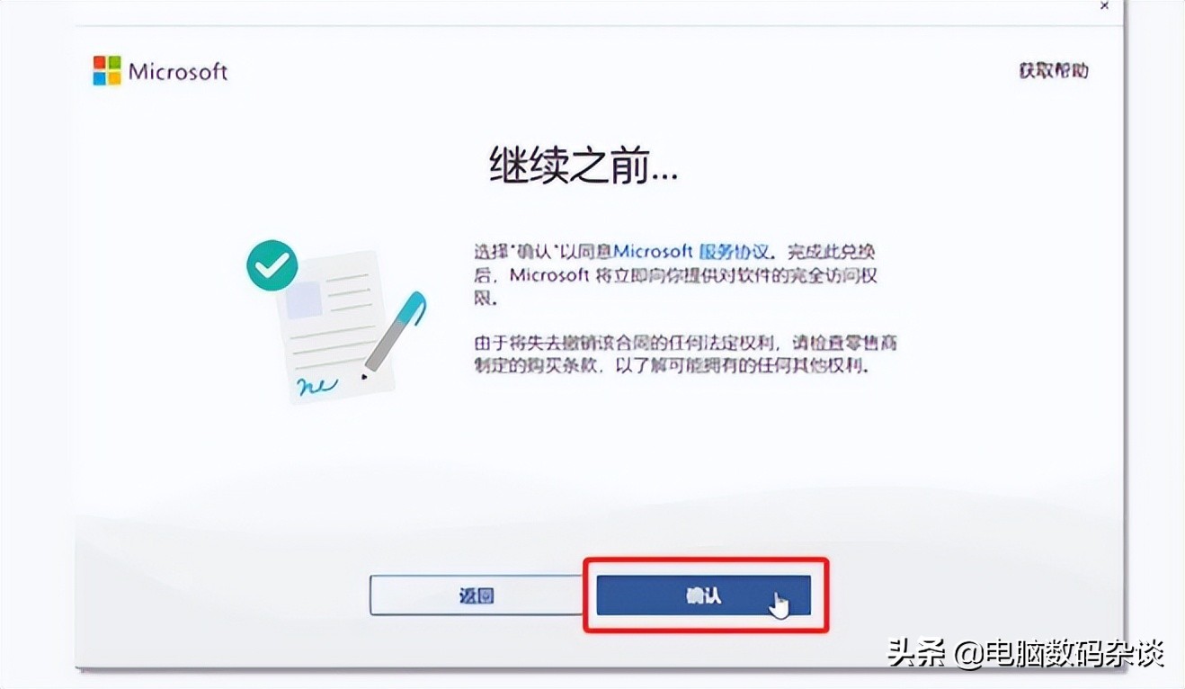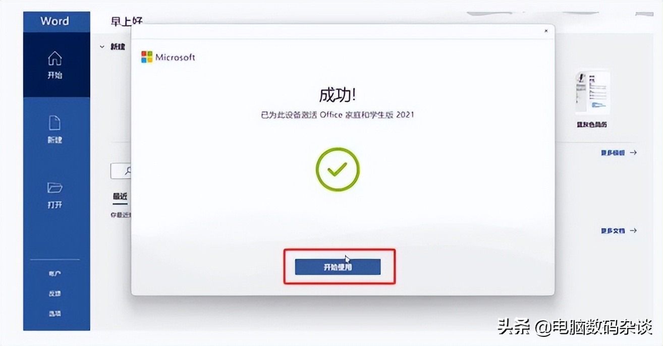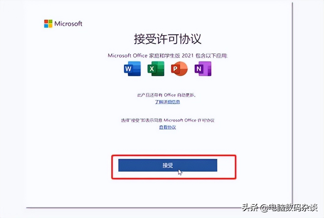 接下来的提示页面点击开始使用即可激活Office。随后弹出接受许可协议页面,点击接受
