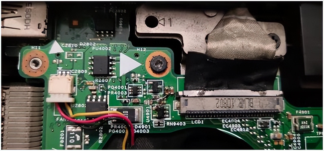 但是同学立即给我一条消息:网上有案例认为这个型号的笔记本白屏是主板的LCDVDD供电IC坏了。网上有处理经验,将这个IC跳过就行。而且还附有电脑详细的图片。