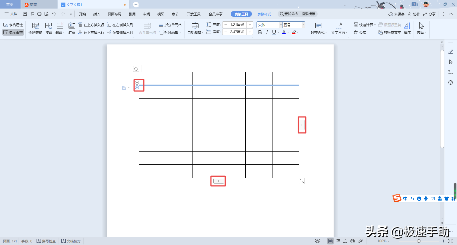 而为了能够让文档中的数据展现的更好,我们就需要在文字文档中插入一些表格,以此来更加明显和直观的展现我们所需要的数据内容。而此时如果我们使用的是WPS来编辑word文档的话,我们直接将鼠标放在表格左侧单元格的下方,此时界面上就会出现一个【-】减号和【+】加号,接着我们点击加号就可以快速的为表格增加行。而将表格的最底部和最右侧,也都会有增加行和列的【+】加号按钮,以便于我们可以快速的来为表格增加行和列。