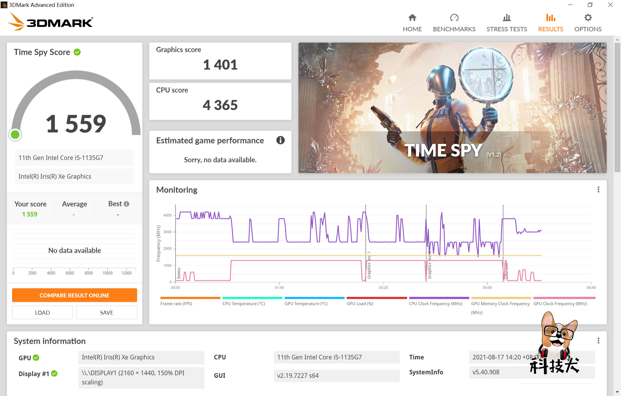 3DMark理论性能测试,realme Book针对于DirectX 12的基准测试《Time Spy》系列测试中的成绩表现不错。