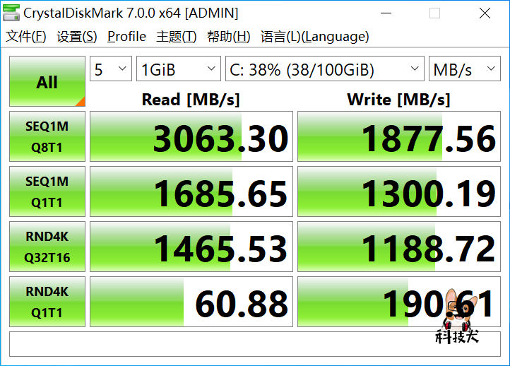 在CrystalDiskMark的测试中,realme Book最大连续读取速度为3063.30MB/s,连续写入速度1877.56MB/s,4K随机读取为60.88MB/s,写入为190.61MB/s。