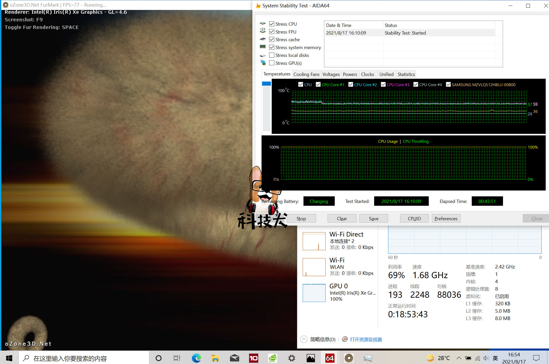 在测试上,使用AIDA64以及FurMark软件在默认模式下对realme BookE进行了约30分钟的双烤测试。从热成像仪实测的结果看,整机平均温度为46.7℃,这样的散热效果以及性能表现,完全能够满足办公、影音及游戏的稳定运行了。