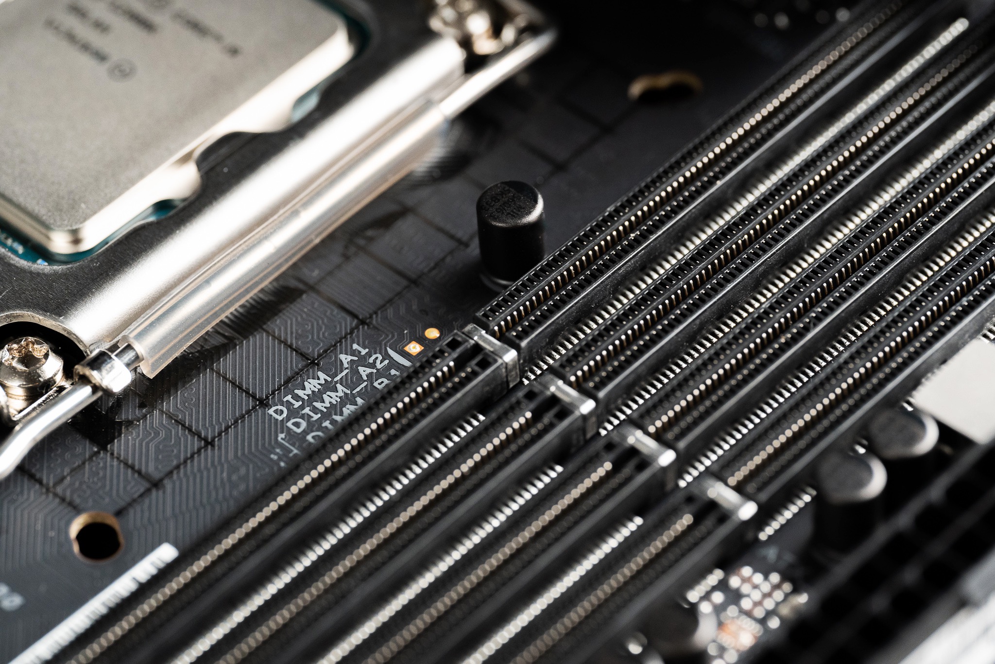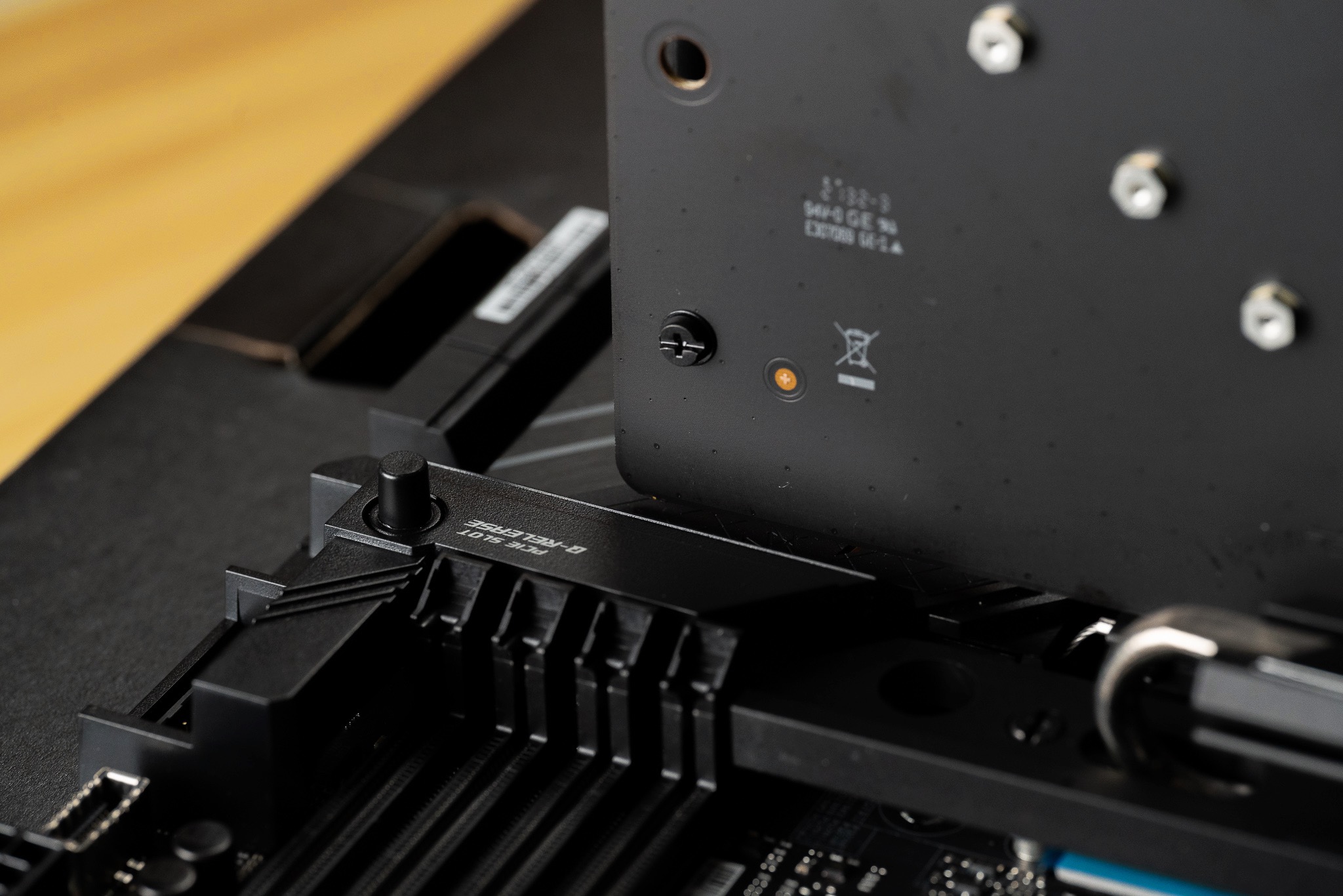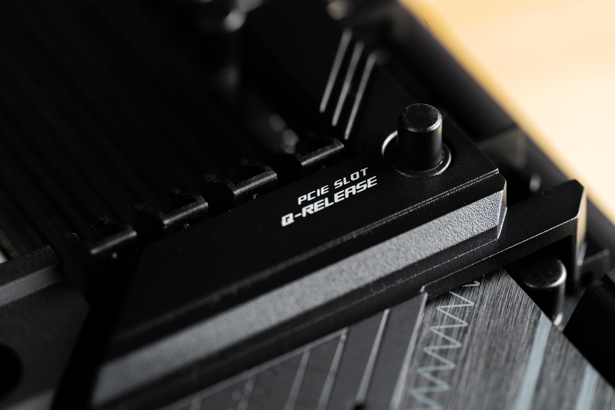 ROG STRIX Z690-E GAMING WIFI的16×插槽还有一个我非常喜欢的设计:为了方便用户更换显卡或其他PCIe设备,ROG在主板上设计了一个与卡扣联动的PCIe插槽按钮。更换显卡时不再需要用一字螺丝刀深入主板,只要轻轻一按就能联动打开卡扣。