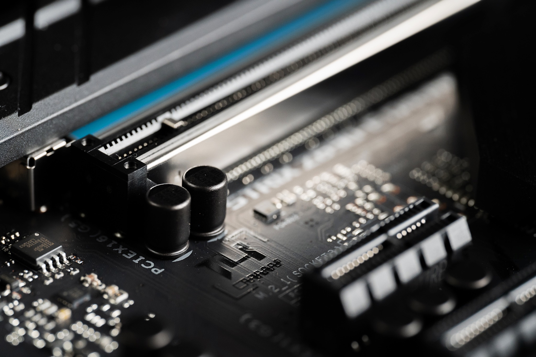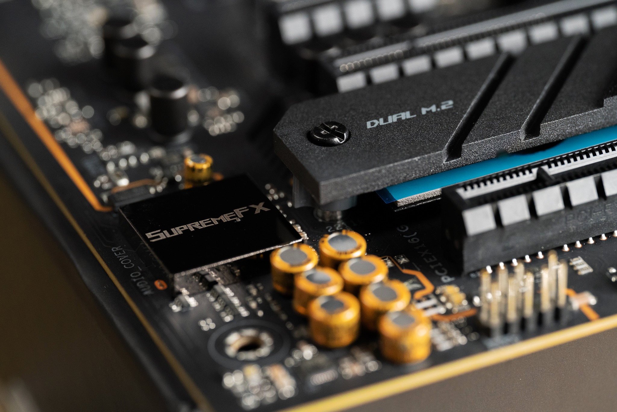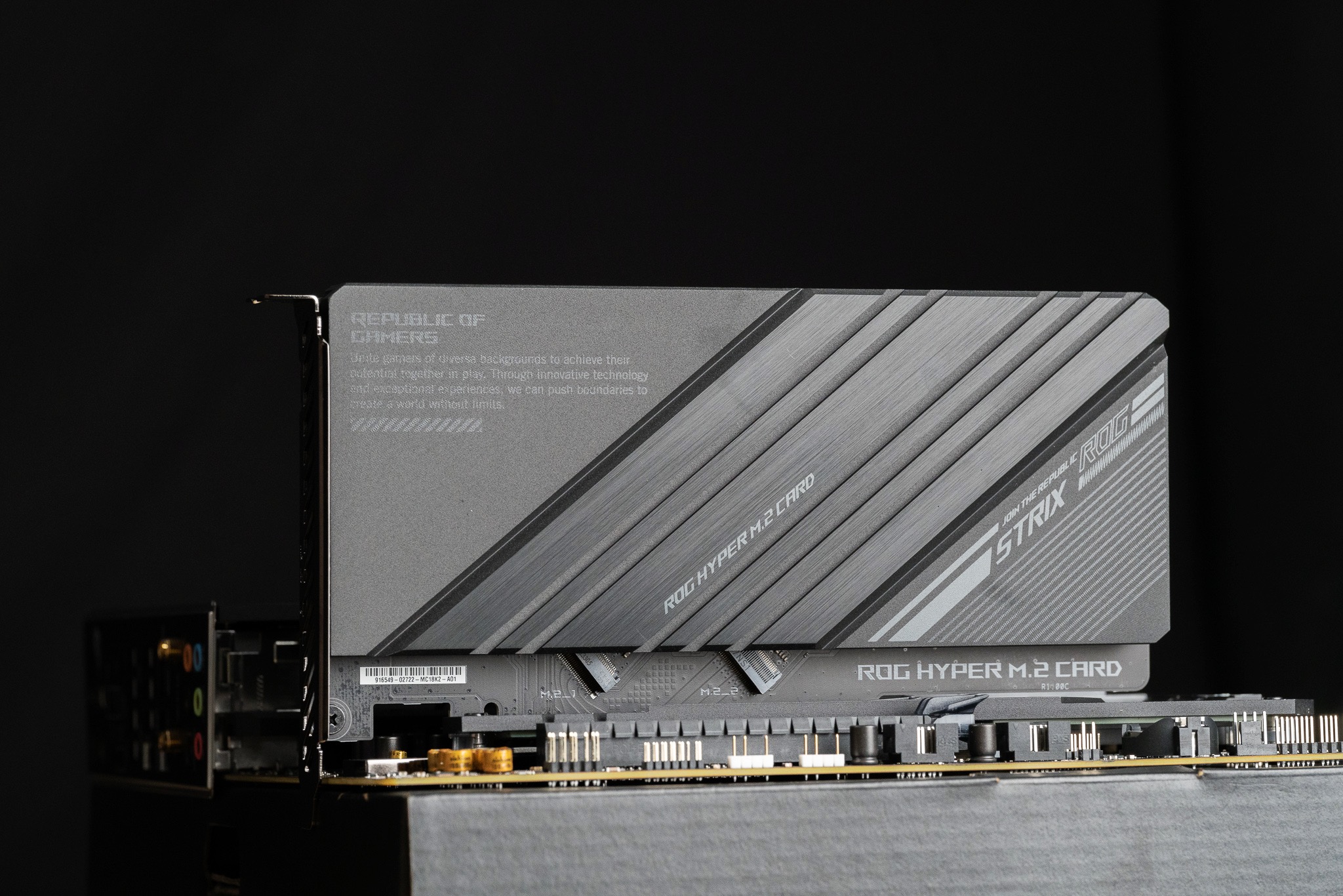 除了这个自带热管的M2硬盘位外,ROG STRIX Z690-E GAMING WIFI下方还有两个独立自带散热马甲的M2硬盘位。但如果3条M2无法满足你的存储需要,主板还随附了一张独立的ROG PCIe M2拓展卡,可以为你提供两个额外的M2硬盘位,带来海量的存储潜力。