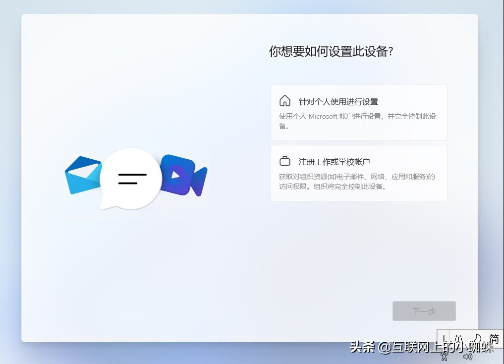 此时电脑会重新启动,启动后出现下面的界面。选择设置使用电脑,针对个人或者工作学校帐户。完成设置后点击【下一步】继续安装。