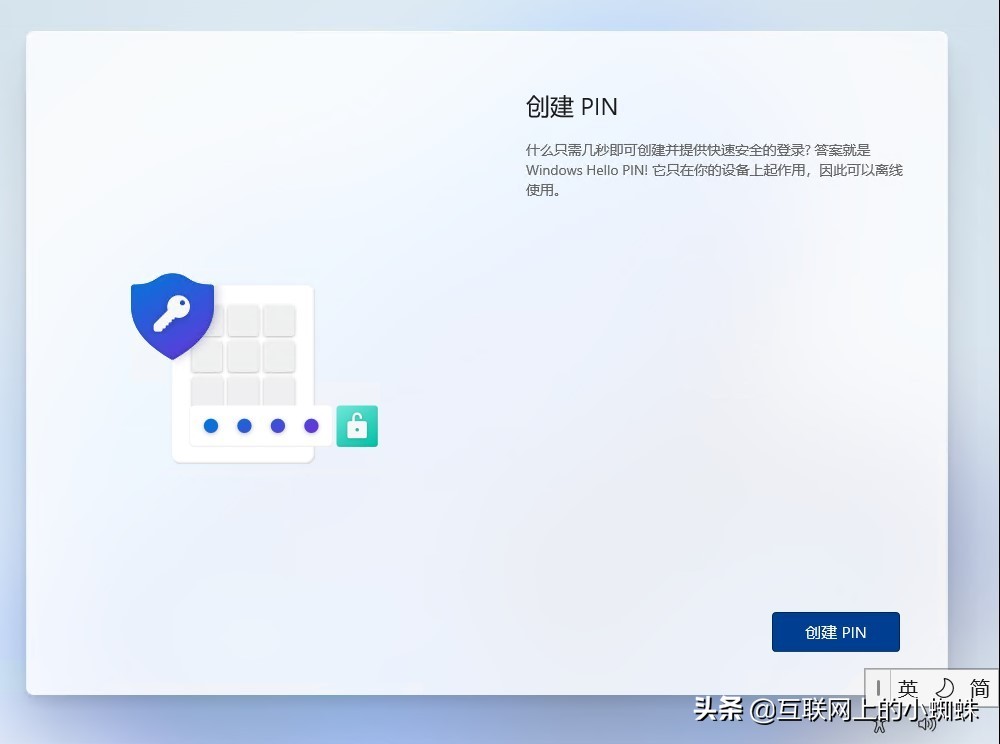 上面的账号和密码验证通过以后,接下来给Windows 11操作系统设置一个登陆的PIN码,即为Windows的登陆密码,该密码可以进行Windows系统的离线使用。点击【创建PIN】继续安装