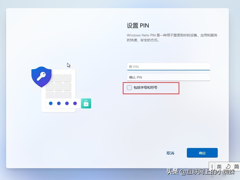 输入PIN,即Windows的密码。如果需要密码中包含字母和字符,可以勾选下面的【包含字母和符号】,完成后点击【确定】