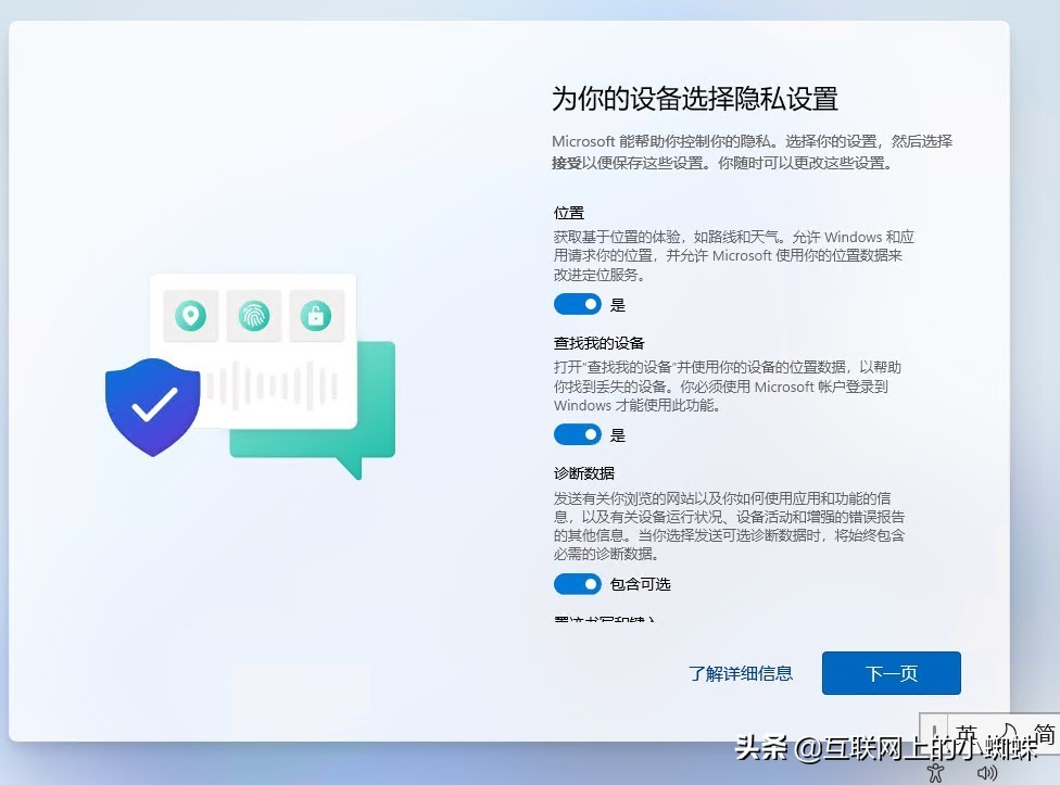 接下来设置电脑的隐私选项,根据需要开启或者关闭相关的隐私选项。完成相关的设置之后,点击【下一页】继续安装。