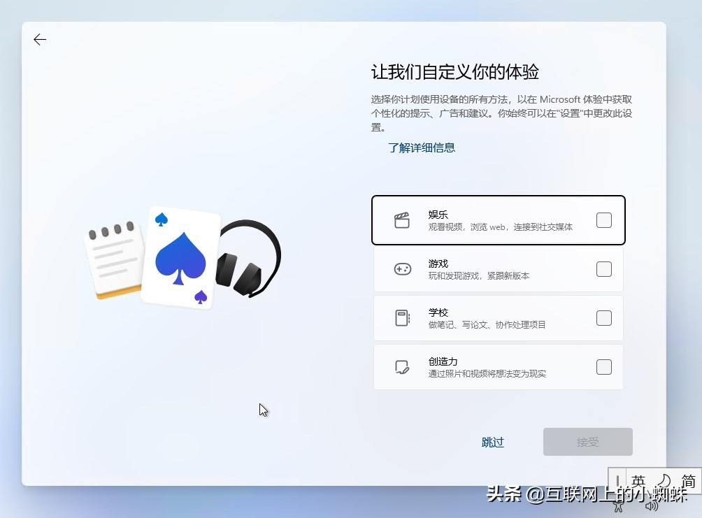 接下来选择Windows 11操作系统需要安装的内容,如果不需要安装可以点击【跳过】记录下一步。