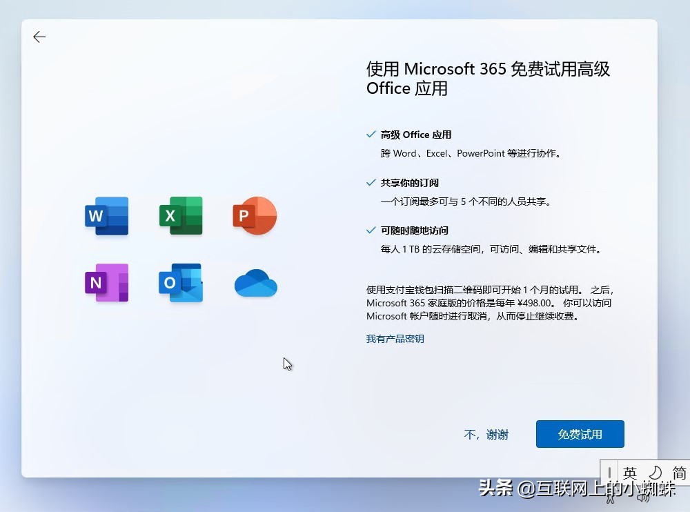 如下,Windows 11出现如下安装office 365的免费试用,如果不需安装该体验可以点击【不,谢谢】跳过。