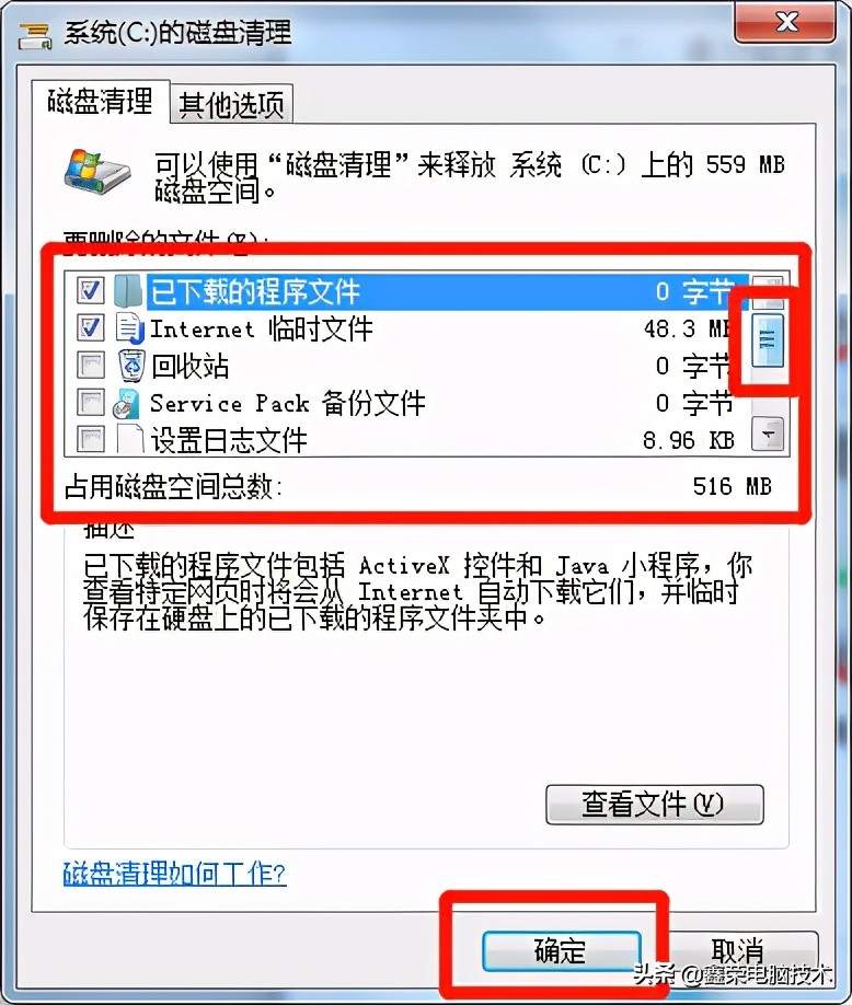3、计算完成后,会提示你可以释放的空间大小,并且可以自行选择你想删除的文件类型,根据你的需要在选项前打上勾即可,然后点击“确定”;
