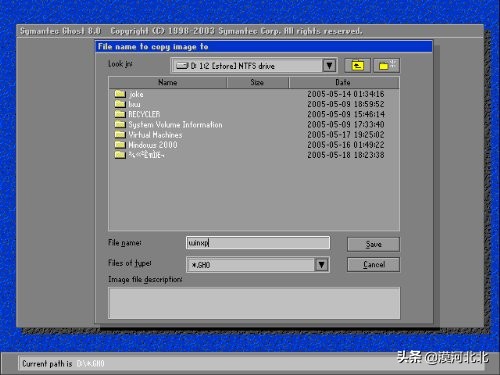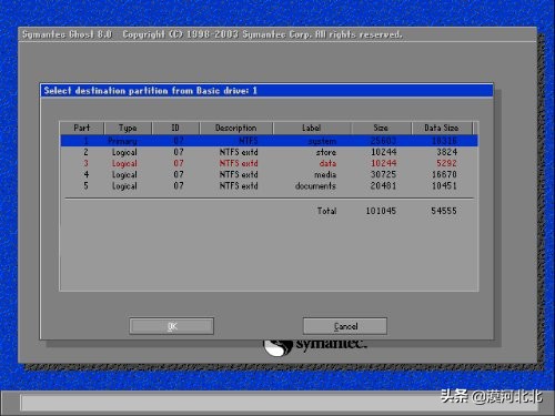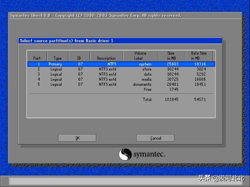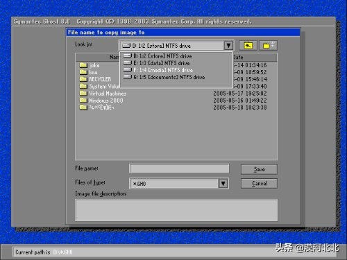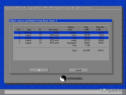 备份分区的程序如下:选择硬盘(图四)->选择分区(图五、图六)->设定镜像文件的位置(图七、图八)->选择压缩比例(图十二).