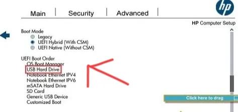 3、继续向下拉,将UEFI Boot Order中的USB hard drive 排在第一行,点击保存,即可通过USB设备启动,如下图所示: