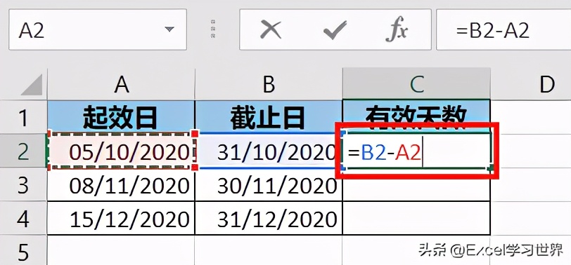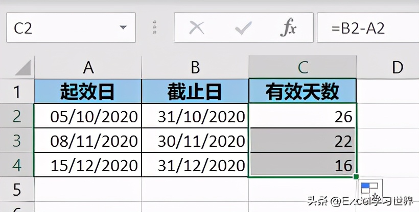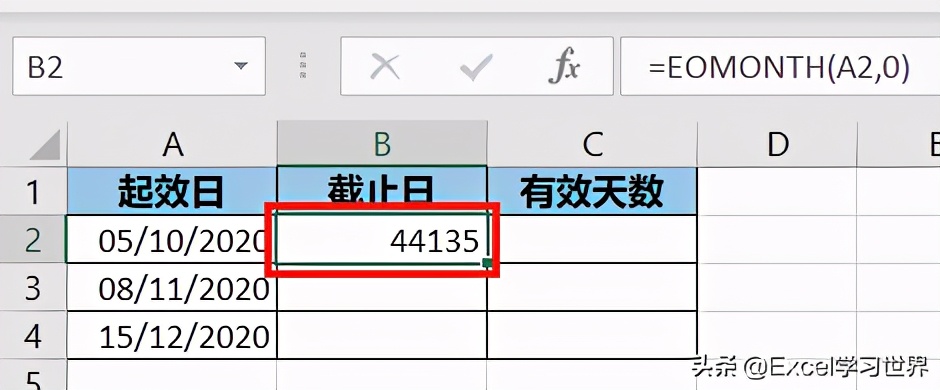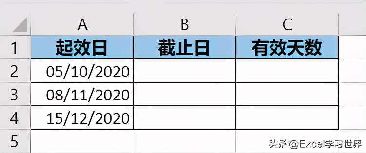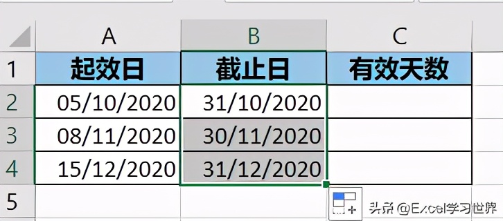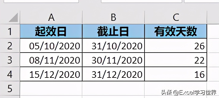 请根据下图 1 中的起效日计算出截止日和有效天数,效果如下图 2 所示。