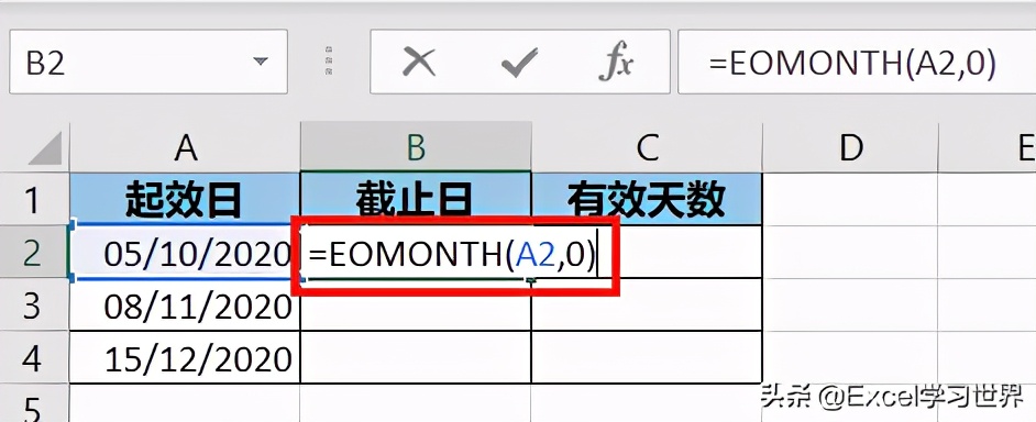 - EOMONTH(A2,0):计算出日期所在月的最后一天
