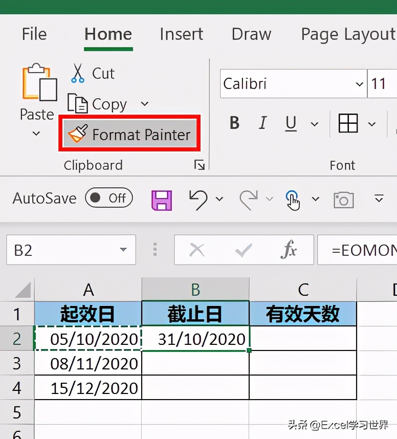 2. 用格式刷将 A 列的日期格式复制到 B2 单元格