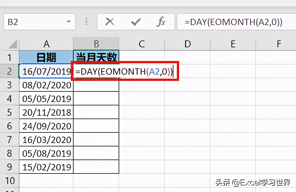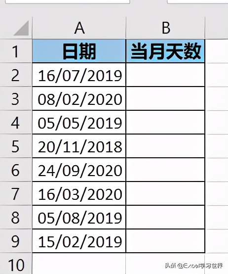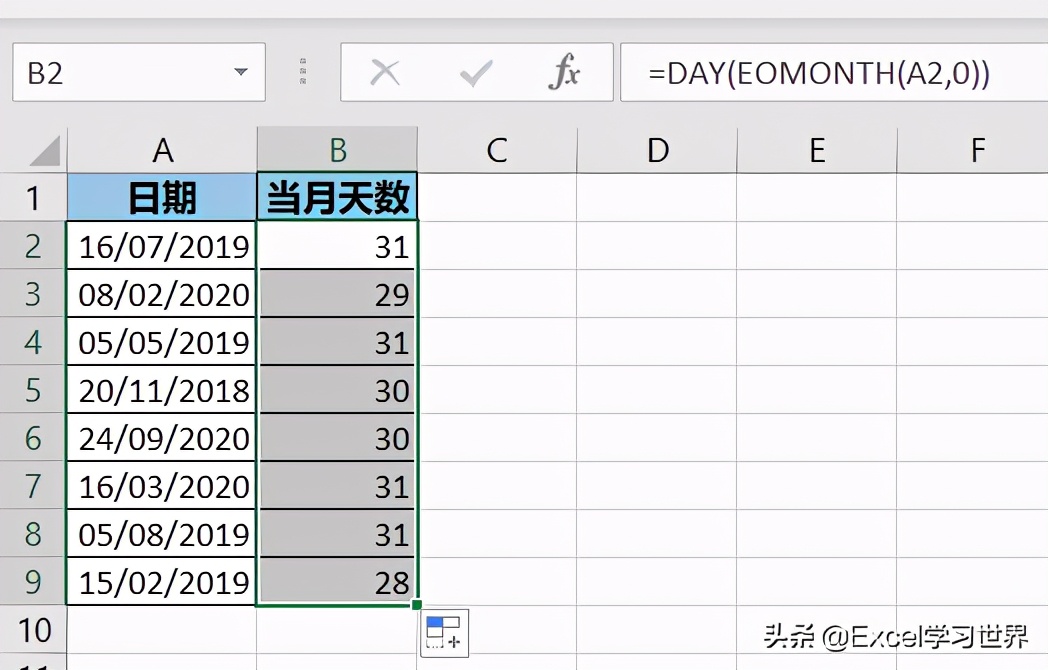 自动计算出 A 列中每个日期所在月的总天数,效果如下图 2 所示。