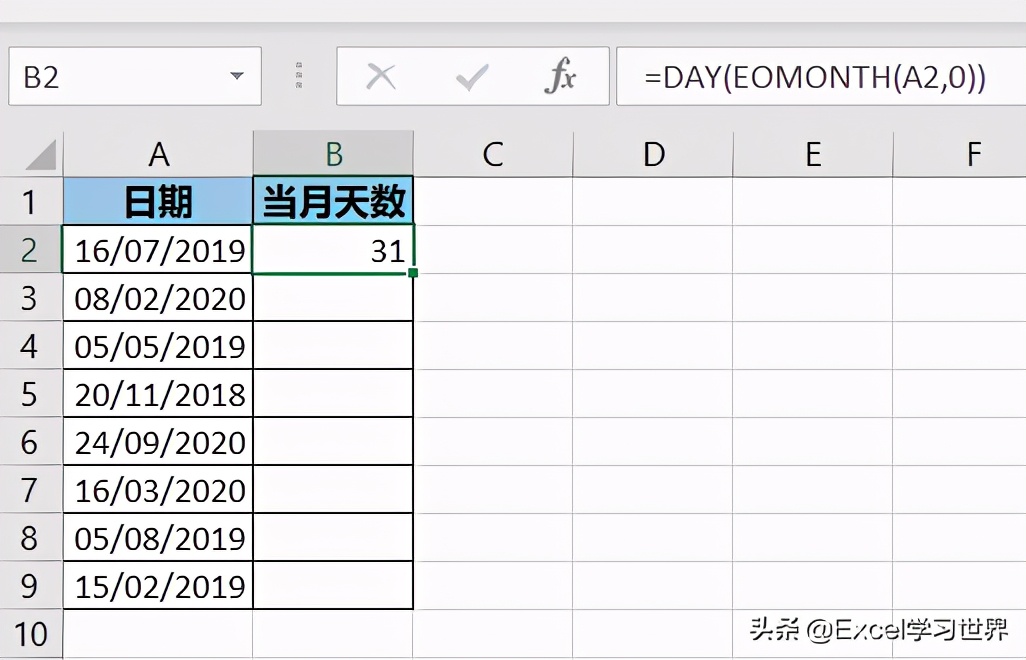 - 该公式表示返回上述函数计算出的最后一天的日。比如,31/07/2019 的日就是 31,也就是当月天数