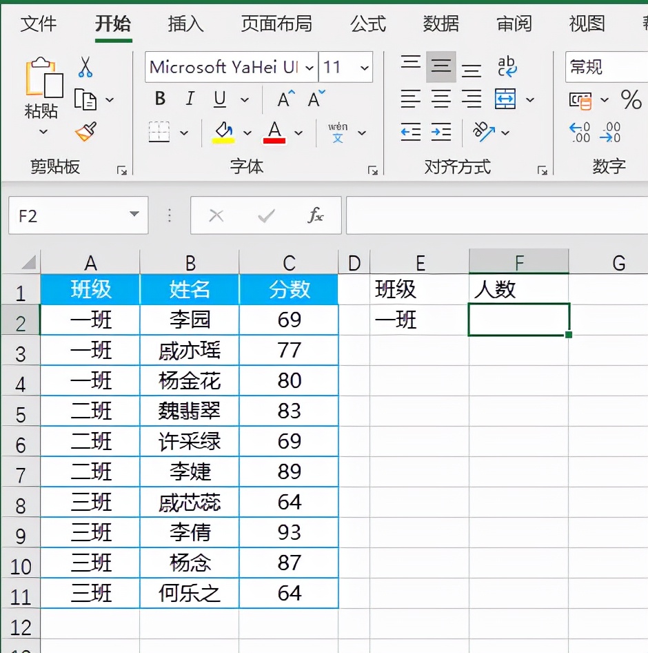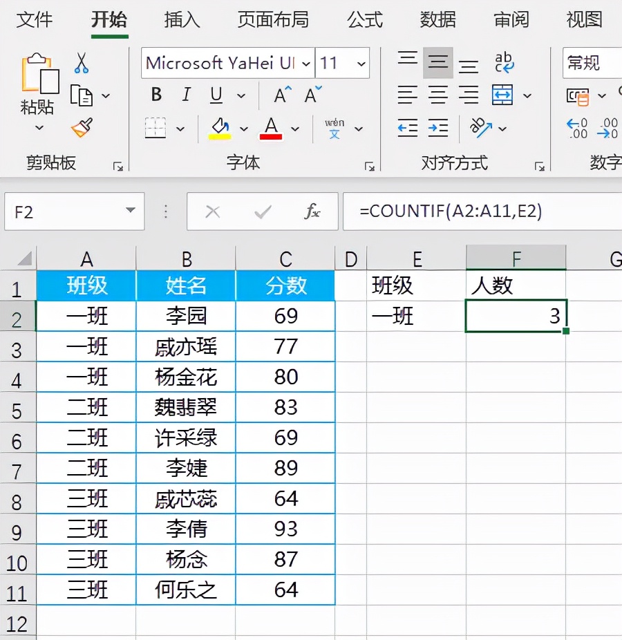 在单元格输入公式=COUNTIF(A2:A11,E2),即可快速得出一班学生个数为3名