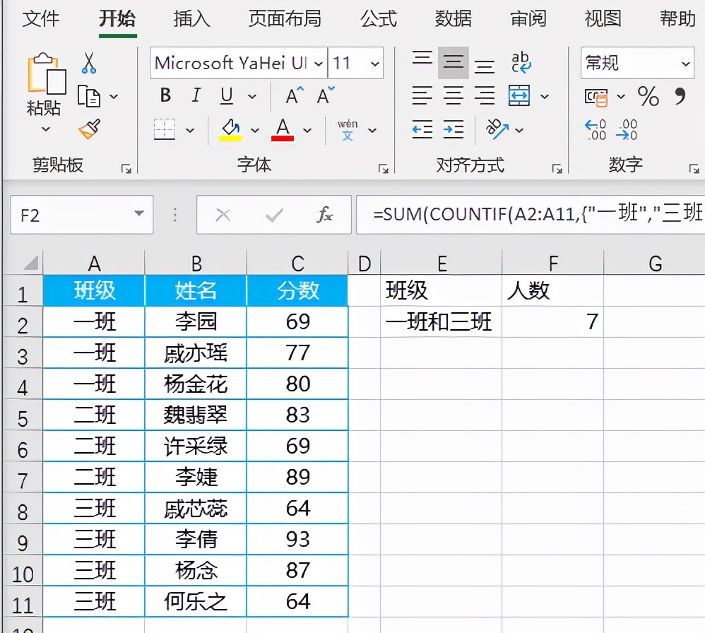 我们现在想要统计出一班和三班的学生人数,如下图在单元格数输入公式=SUM(COUNTIF(A2:A11,{“一班”,”三班”}))即可求出一班和三班的学生人数为7