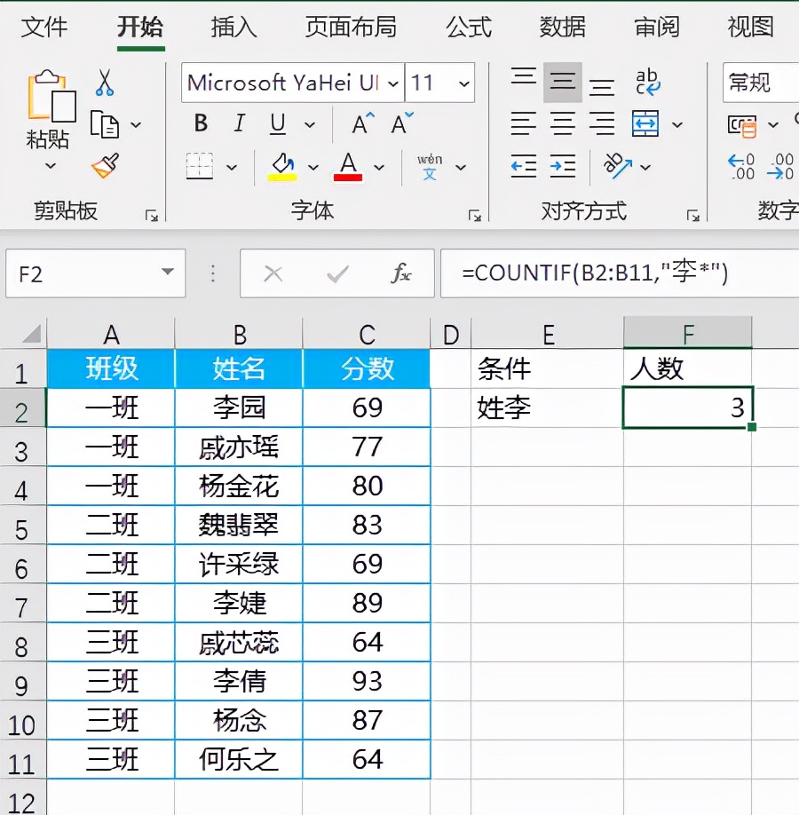 通配符问号匹配任意单个字符,因此姓李且姓名为三个字,可以表示为李??。这里我们就可以把公式写为=COUNTIF(B2:B11,”李??”)