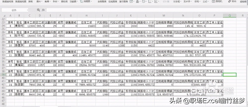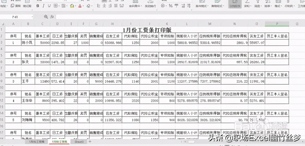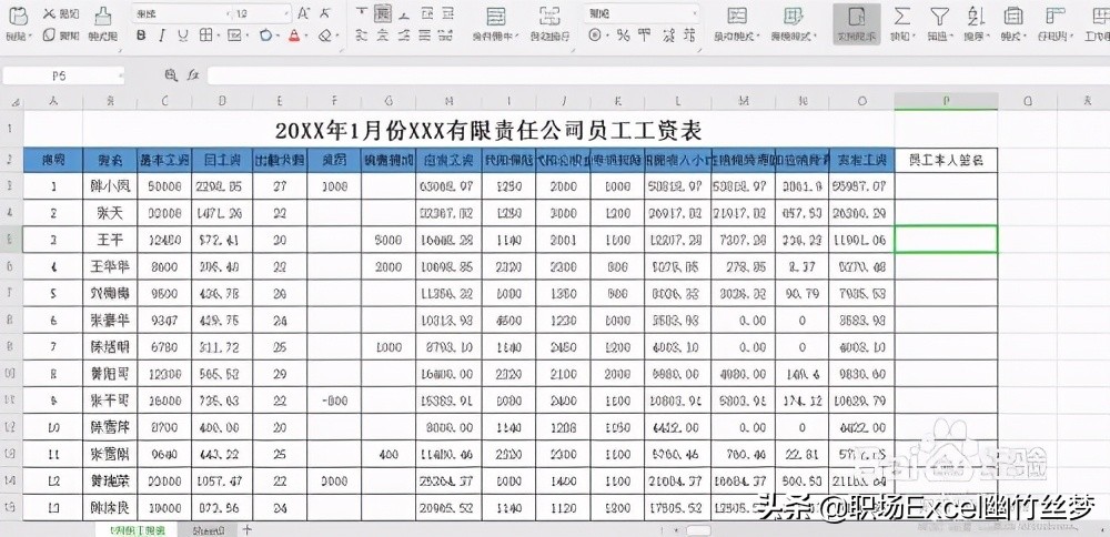 1、用excel打开需要制作工资条的工资表,包含序号、姓名、基本工资、日工资、出勤天数、奖罚、销售提成、代扣代缴保险、公积金、个税以及实发工资、员工本人签名等信息,如图所示: