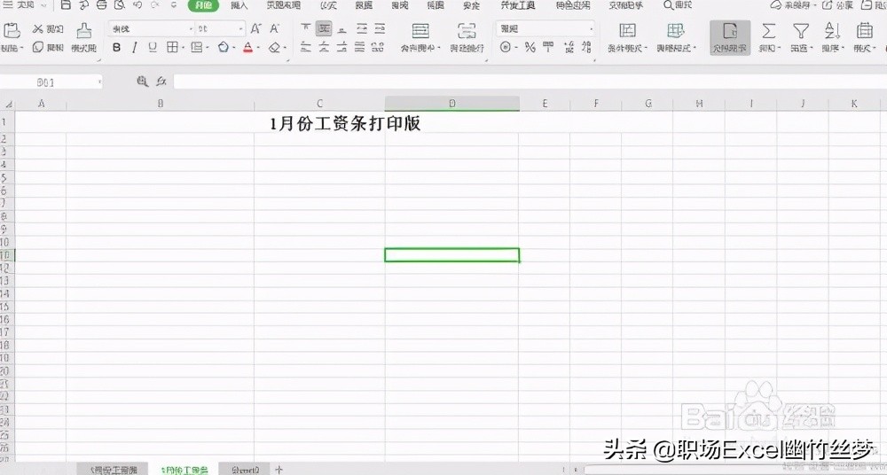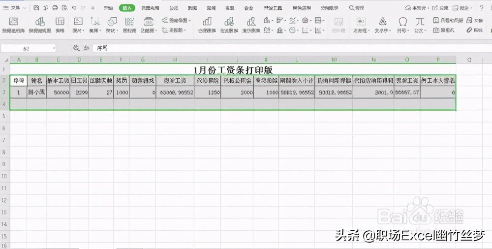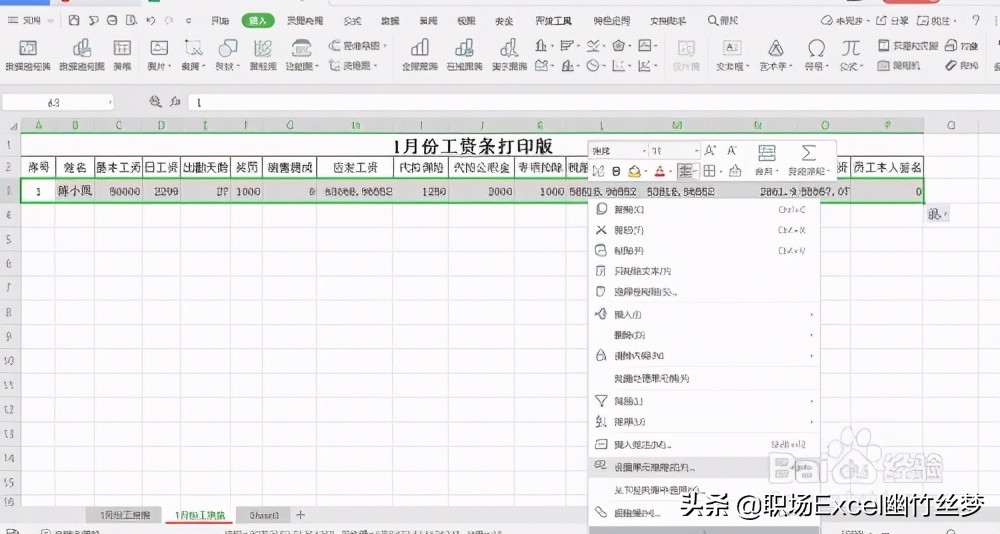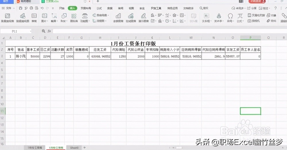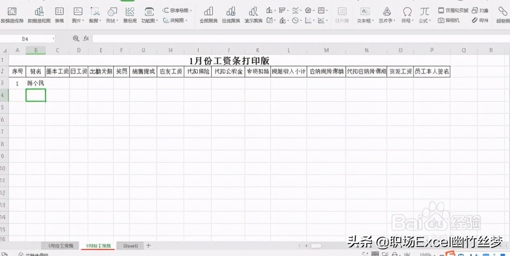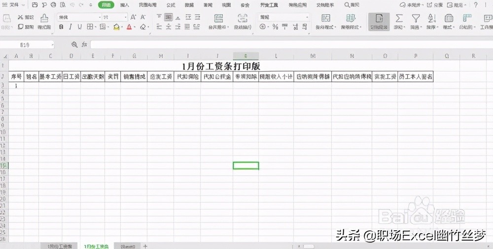 2、点击工作表名称后面+,增加一张新的工作表sheet2,并将其命名为“1月份工资条”,如图所示:将工资表的表头复制到1月份工资条表格中,并在序号下面写上1,如图所示: