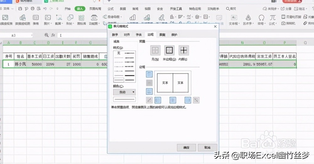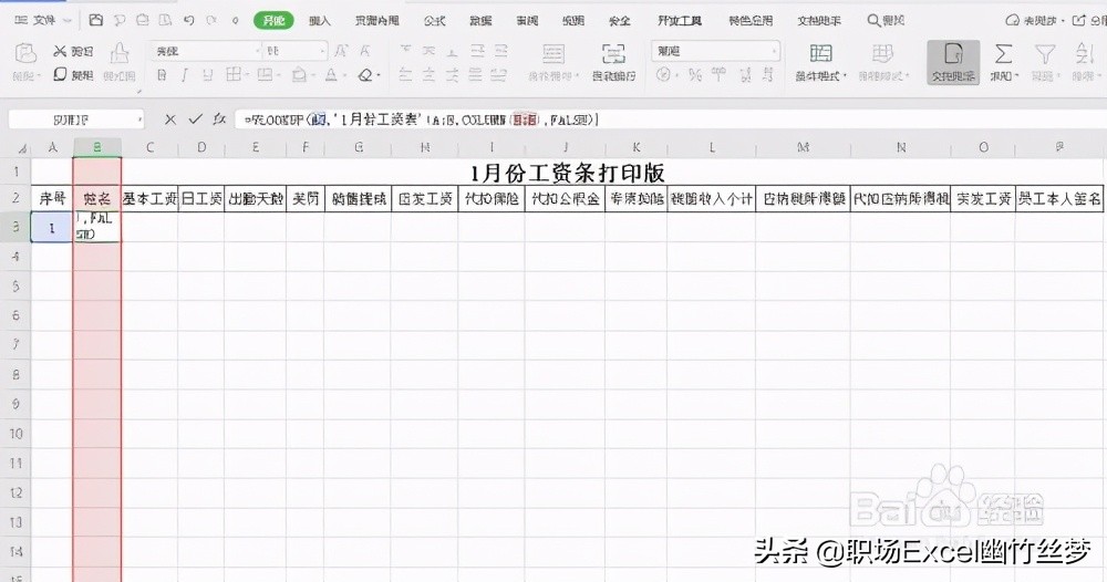 3、在”1月份工资条“表格”姓名“下面的单元格写上公式=VLOOKUP($A3,’1月份工资表’!$A:B,COLUMN(B:B),FALSE),公式中的”$“是固定后面的序列不变,然后按enter键,第一个员工的姓名即可以出来。然后将鼠标放在第一个员工姓名“陈小凤”单元格的右下角,当鼠标变为实心+时,按住鼠标左键不动往左拉到“员工本人签名”下的单元格,即可出现第一个员工的工资明细条。然后选中第一个员工工资条,单击右键,选择”设置单元格格式“,进入单元格格式对话框,选择外边框和内边框,即可为第一个员工的工资条加上边框。如图所示: