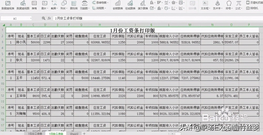 5、选中整个工作表,将鼠标放在2-3行之间,当鼠标变成实心+时,按住鼠标左键不动上下拖动鼠标,调整所有员工工资条的行距。将鼠标放在各列之间,当鼠标变成实心+时,按住鼠标左键不动左右拖动鼠标,调整所有列距。然后接上打印机,按打印机预览调整格式即可以打印出来裁剪下发给员工啦。