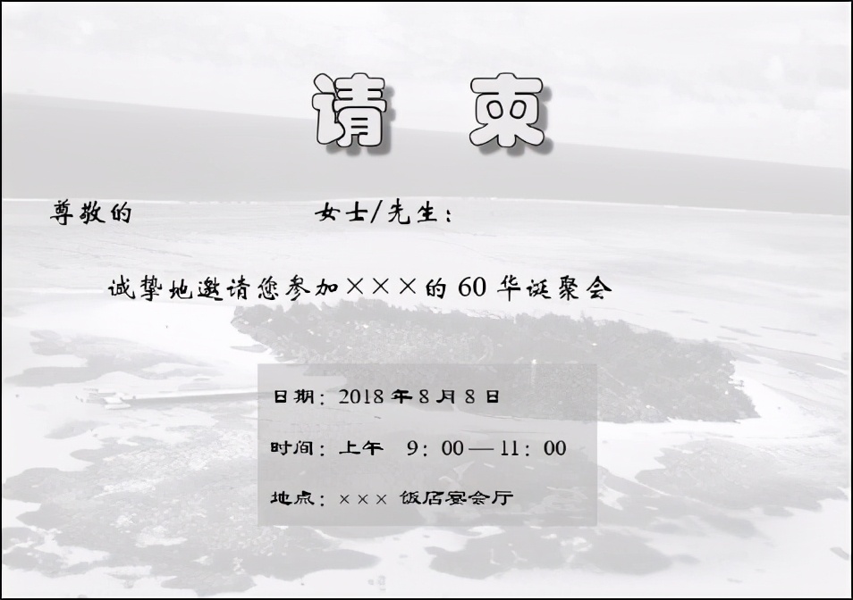 下图是一份制作好的请柬。请柬中包括了文字、背景、图形、图片、艺术字等组成元素。该案例的教学目标是认识图形操作对象与文字、表格操作对象的区别,学习图形、图片的建立、编辑和修饰,以及图文混排的方法和技巧等。