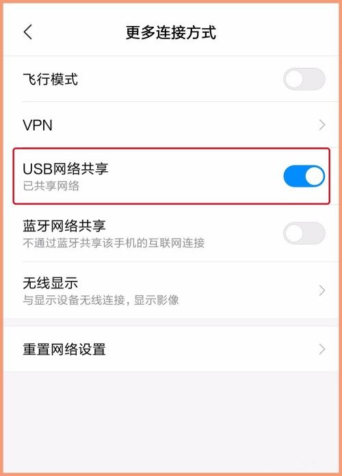 值得注意的是,必须是先将数据线插入到USB接口连接电脑,因为若不连接电脑,上一步操作位置“USB网络共享”呈灰色状态,意味着不可操作。