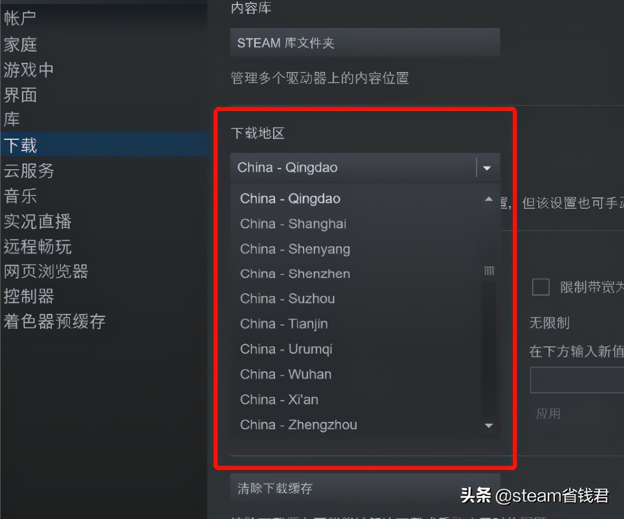 - 选择右侧“下载地区”设置按钮,更换一个下载地区,点击右下角确定。