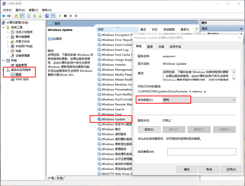 鼠标右击「此电脑」,并点击「管理」进入计算机管理页面,找到“服务和应用程序”并打开选择程序并进入,找到“Windows Update”,右击选择属性并将启动类型改为“禁用”,最后点击确定。