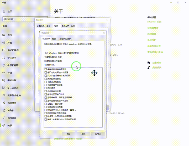首先,在桌面中右击「此电脑」,选择「属性」,进入页面后选择「高级系统设置」,在性能选项中进入「设置」,然后我们在视觉效果中选择「调整为为佳性能」。