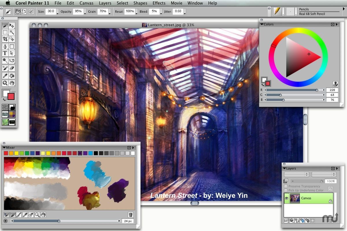 painter:数码素描与绘画工具的**选择,是一款极其优秀的仿自然绘画软件,拥有全面和逼真的仿自然画笔。它是专门为渴望追求自由创意及需要数码工具来仿真传统绘画的数码艺术家、插画画家及摄影师而开发的。它能通过数码手段复制自然媒质(Natural Media)效果,是同级产品中的佼佼者,获得业界的一致推崇。