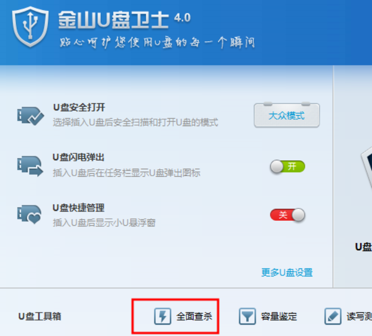 1、下载金山U盘卫士4.0,双击打开,将U盘插入电脑,选择下方的全面查杀。