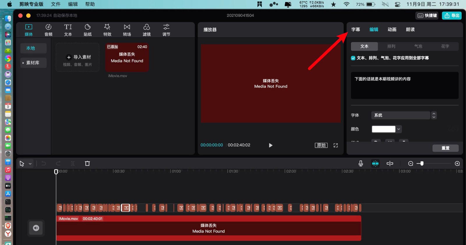 2、然后右边点击字幕,那么此时在字幕滚动表可以批量修改字幕。