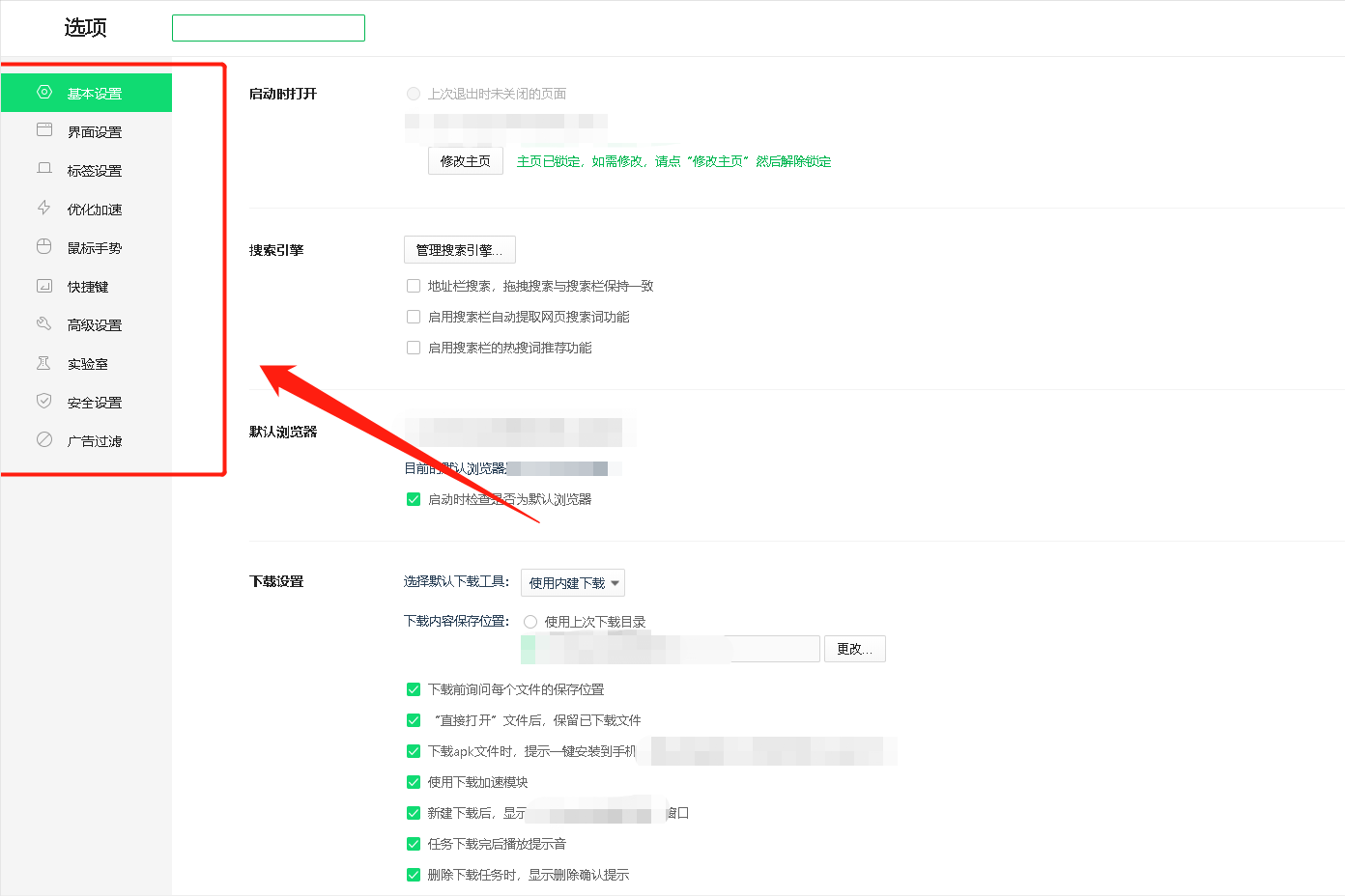 进入设置选项后,我们会发现左侧有一排菜单栏,而去除广告弹窗的选项,就隐藏在这里面。如下图: