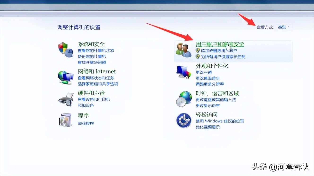 1第一步鼠标单击开始菜单,选择控制面板,进入页面,将查看方式改为类别,单击用户账户和家庭安全,选择用户账户